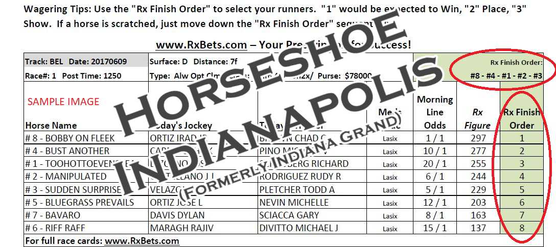 The RxBets.com Daily Selection Report is our proprietary analysis of the daily race card for a track. It provides the RxBets.com projected finish order for each race.